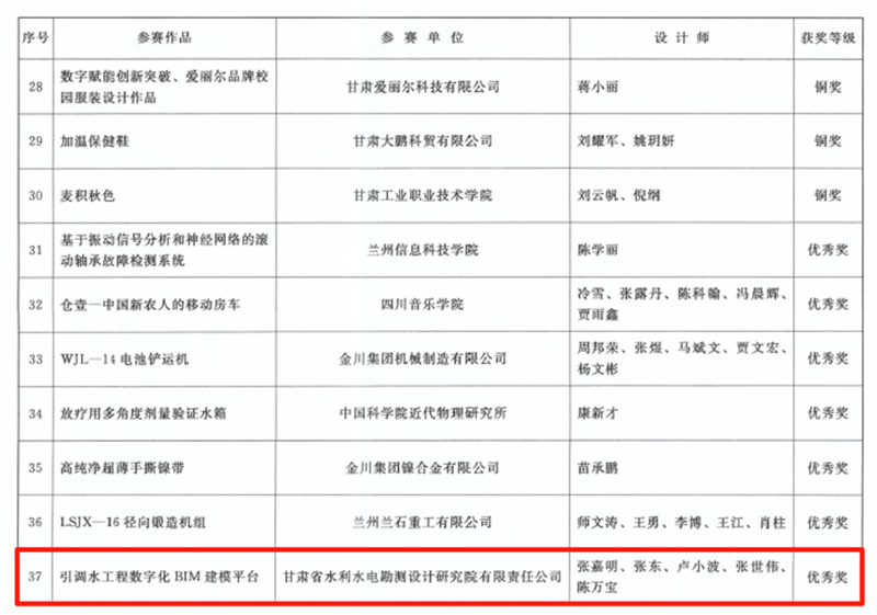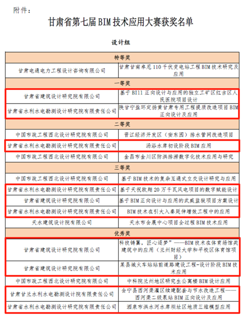 近日,甘肅省第五屆“創新杯”工業設計大賽、第十七屆全省職工優秀技術創新成果獎和甘肅省第七屆BIM技術應用大賽的評選結果相繼公布,甘肅工程咨詢集團15項技術和研究成果獲獎。
