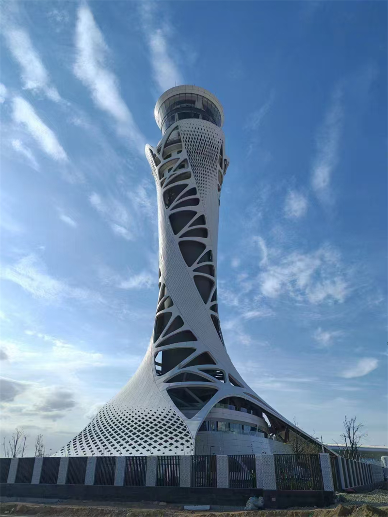 項目總投資13.43億元,塔臺建筑高度99.9米,是全國空管分局有史以來建設規模最大、投資最大的空管建設項目,創造了多項分局站建設第一。項目總體以“敦煌飛天”與“絲綢之路”為靈感,塔臺采用鋼結構斜交網格外框+鋼筋混凝土核心筒設計,空管工作區采用鋼筋混凝土框架+首層BRB支撐+基礎橡膠隔震支座設計,鋼結構總量達3561噸。