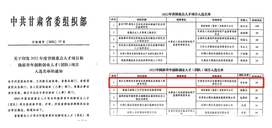 近日,省委組織部印發(fā)了《2022年度省級重點(diǎn)人才項(xiàng)目和隴原青年創(chuàng)新創(chuàng)業(yè)人才(團(tuán)隊(duì))項(xiàng)目入選名單》,甘肅省水利水電勘測設(shè)計(jì)研究院有限責(zé)任公司申報的《南水北調(diào)西線甘肅省水資源需求及配套工程體系研究》成功入選“2022年隴原青年創(chuàng)新創(chuàng)業(yè)人才(團(tuán)隊(duì))項(xiàng)目”,是集團(tuán)公司唯一入選項(xiàng)目。