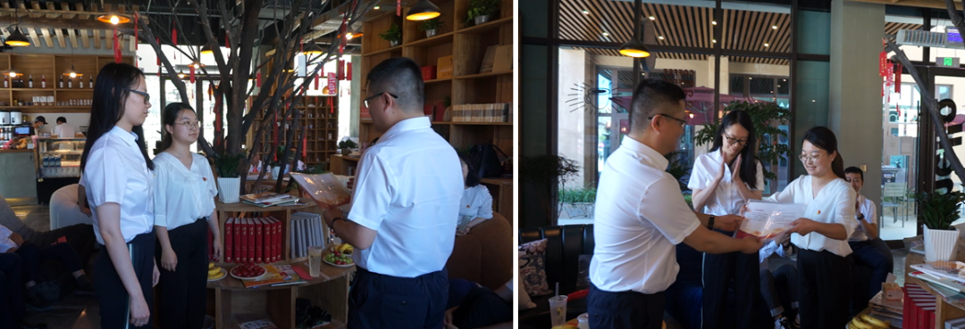 活動舉辦當天,恰逢黨員袁田同志和仲亞男同志的“政治生日”,為了讓黨員同志們切實感受到來自黨組織的溫暖與關(guān)懷,引導(dǎo)廣大黨員進一步強化身份意識、宗旨意識和責(zé)任意識,交流會現(xiàn)場還為兩位黨員同志舉辦了一場特別的“政治生日會”,為她們送上一張?zhí)刂频摹吧召R卡”、一枚新黨徽、一本新黨章,以極富儀式感的活動形式,提醒激勵黨員同志們要時刻謹記黨員職責(zé),不忘初心、牢記使命,在工作和生活中時刻以黨員標準嚴格要求自己,切實發(fā)揮黨員干部的先鋒模范作用。